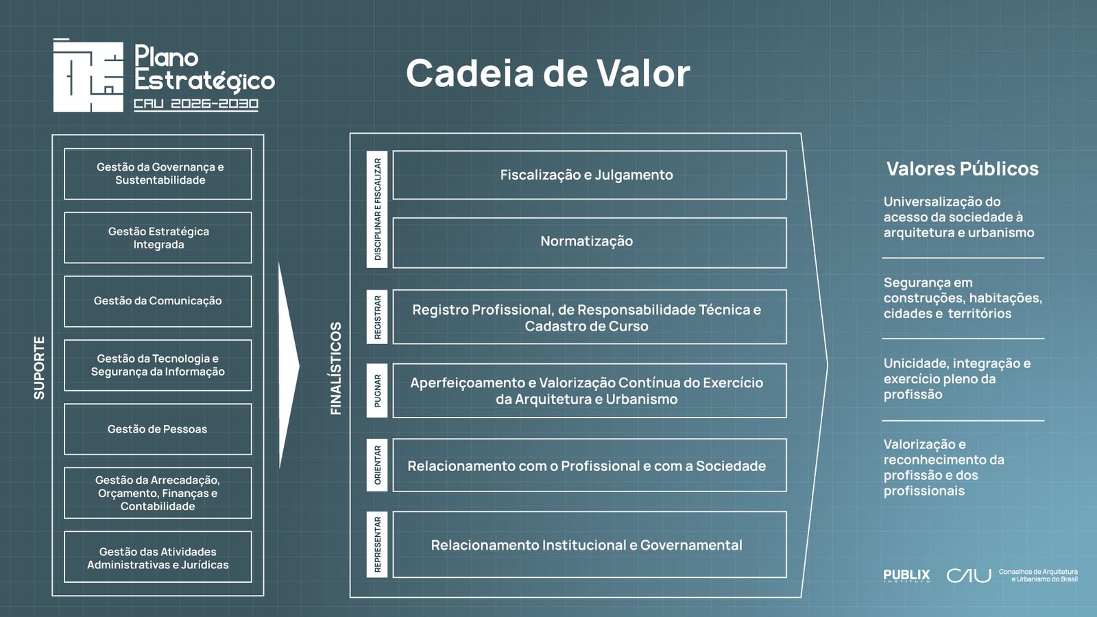Para aprofundar o conhecimento sobre os macroprocessos da cadeia de valor, o CAU disponibiliza o Caderno da Cadeia de Valor, documento que detalha as entradas, saídas e processos de cada macroprocesso.